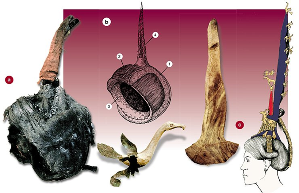 Her elaborate costume revealed that she was a high-status woman. She wore a silk tunic and a long woolen skirt with three horizontal bands. Each band was dyed a different shade of red. The skirt included a soft belt, braided with woolen lace threads, and finished with tassels. Her legs stayed warm in felt thigh-high stockings decorated with felt appliqués. Most astonishing was her hat, an 84 cm long headdress made of felt and decorated with the figurine of a deer covered in golden foil and 15 wooden birds.