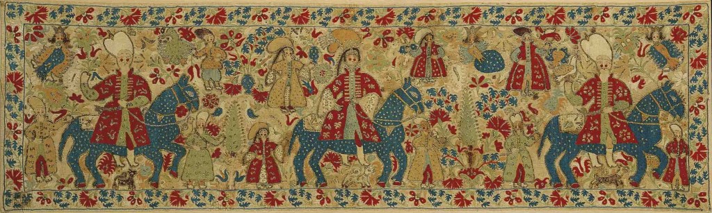 Bridal cushion depicting the mounted procession of the groom and the bride and her parents standing in the centre. Ioannina, Epirus, 18th century.