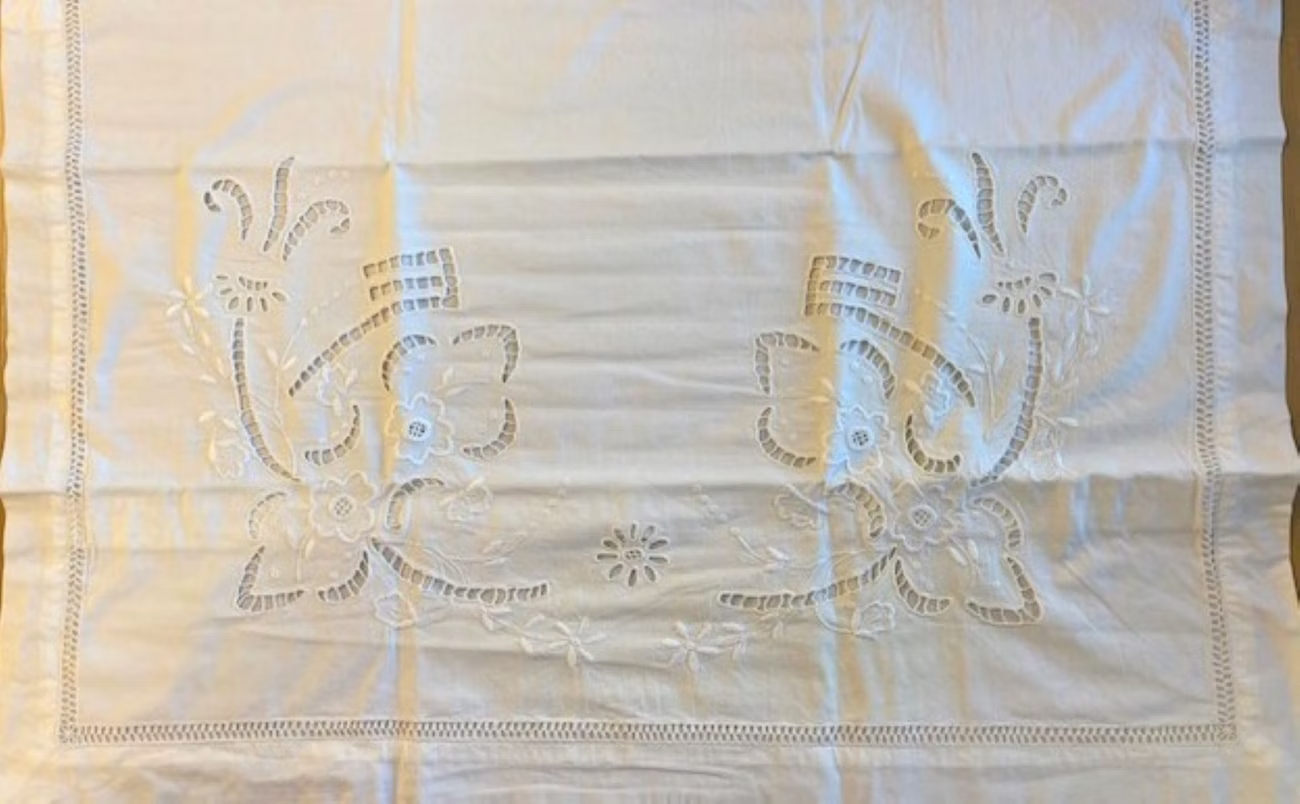 Part of my dowry and Greek heritage is an elaborate pillowcase that my paternal grandmother embroidered by machine. It is a white cotton pillowcase accented with cutwork embroidery in satin, buttonhole, and stem stitches. The design features stems, leaves, flowers, tiny eyelets, buttonhole bars, and a decorative azour (from French ajour meaning cutwork) border. This whitework embroidery is called kofto (Greek: κοφτό), which means “cut.” It was a very popular technique in the ’70s and ’80s in Greece.